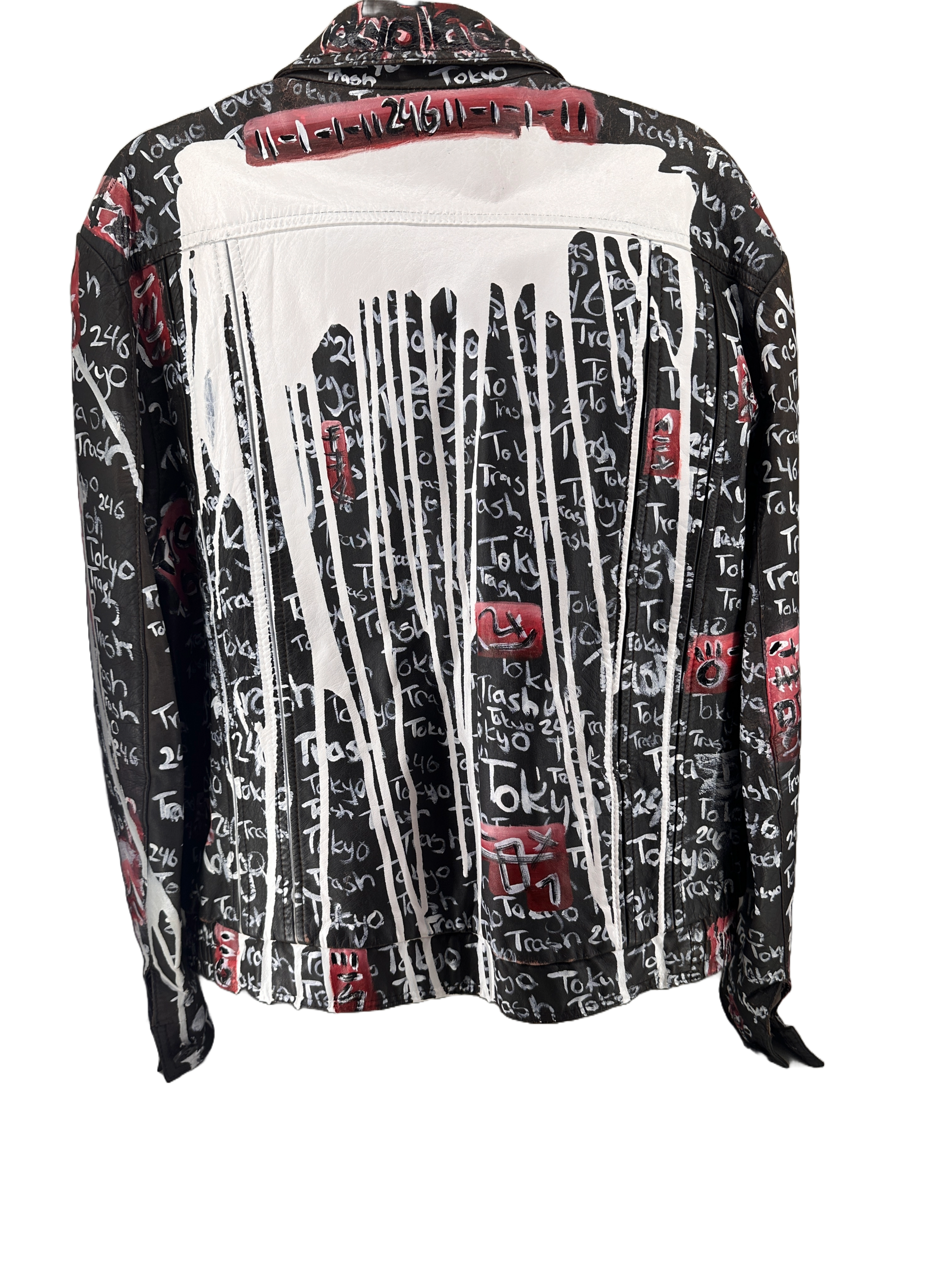 When I found a jacket called Steve, I knew I was immediately sold and I had to get it. When it arrived, I immediately saw that I wanted to make it in a punk style and started writing the words Tokyo and trash over and over and over again. for the 246 is the bloodline that runs through the whole city so I also added it in different parts of the design.
